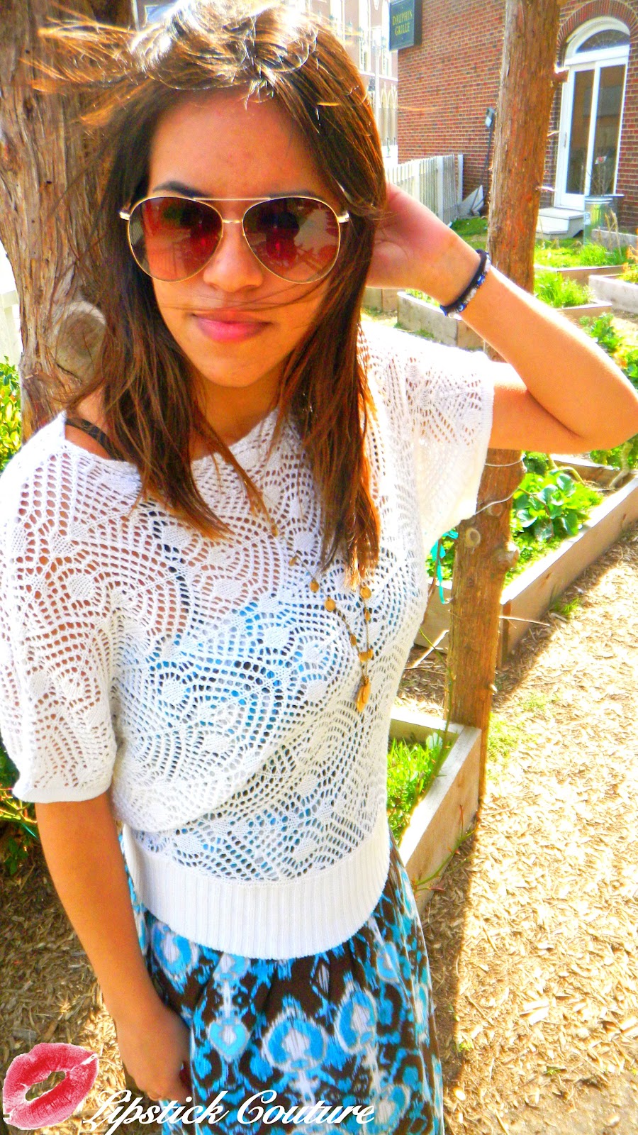 Forever 21 crochet top, maxi dress, rings, sunglasses; J. Crew necklace; Target wedges; Gifted blue, beaded bracelet; Essie nail polish: Absolutely Shore